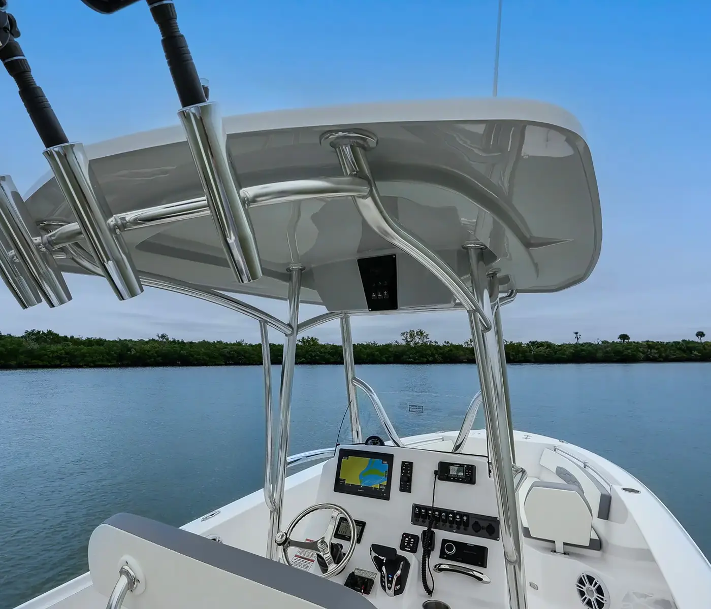 | Anodized T-Top w/ Canvas, 2 Spreader Lights, 4 Rod Holders | Bow Cushions w/ Forward Facing Backrests | Single 9” or 12” Garmin Display Package w/ Transducer and VHF Radio and Antenna | Edson Steering Wheel Upgrade to 13” Power Wheel – Stainless, Black or Satin Finishes |